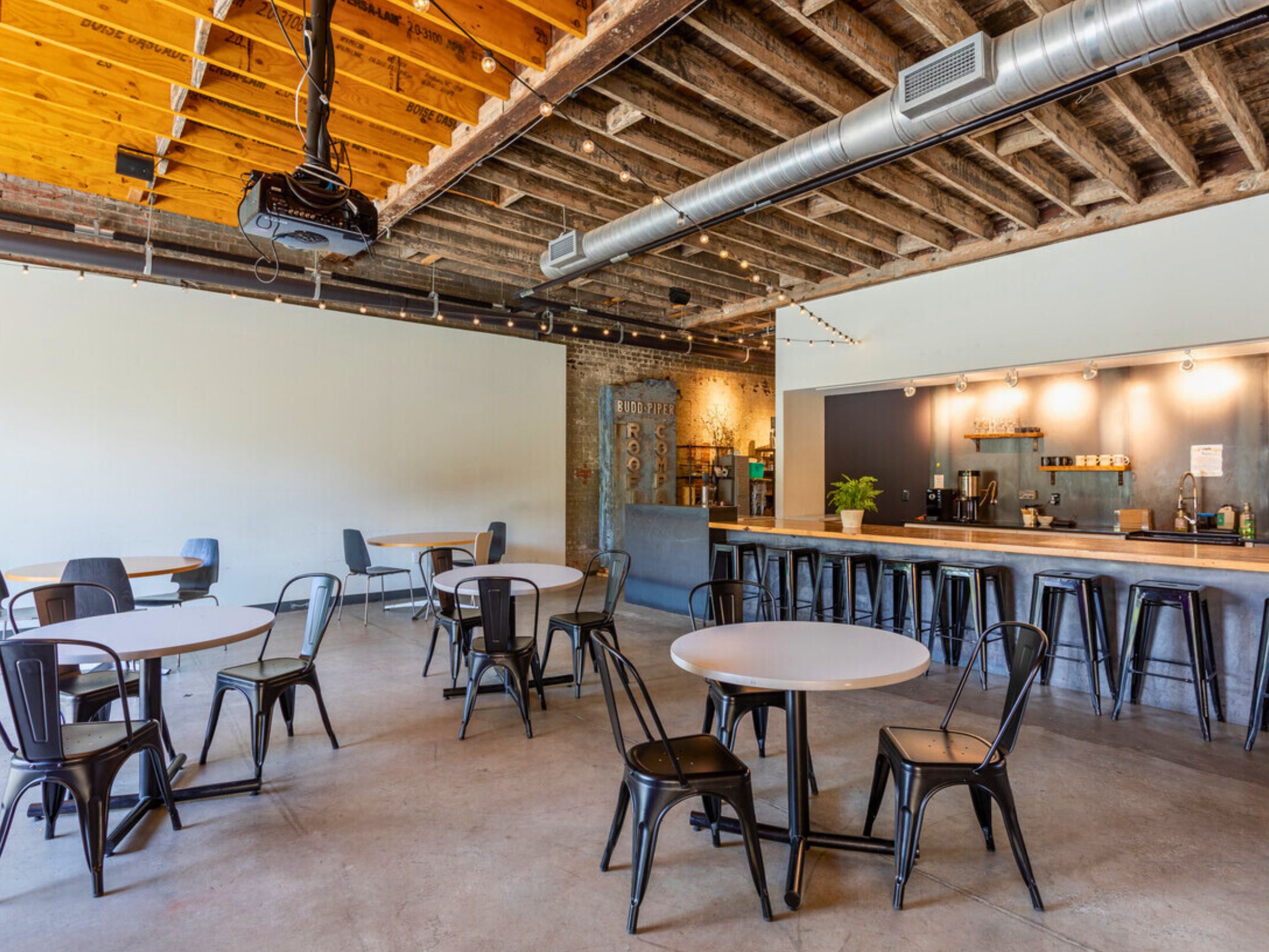 Your daytime lunch room and casual meet-ups—by night, an industrial event setting with bar service.