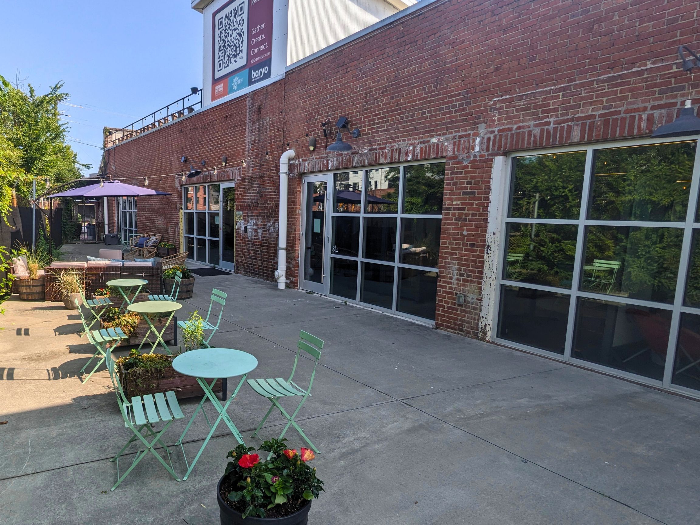 Shaded, open-air space off the café and warehouse—great for coffee breaks, calls, and outdoor gatherings.
